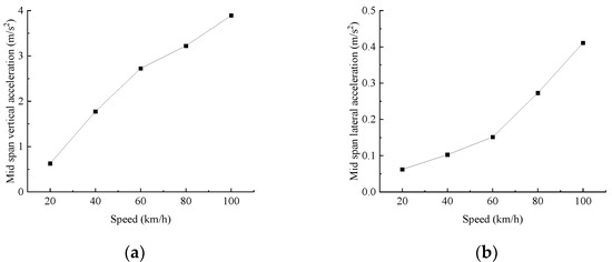 Mid-span acceleration response under different speed levels (unit: m/s2): (a) Mid-span vertical acceleration. (b) Mid-span lateral acceleration.