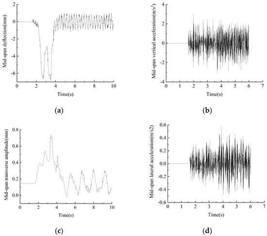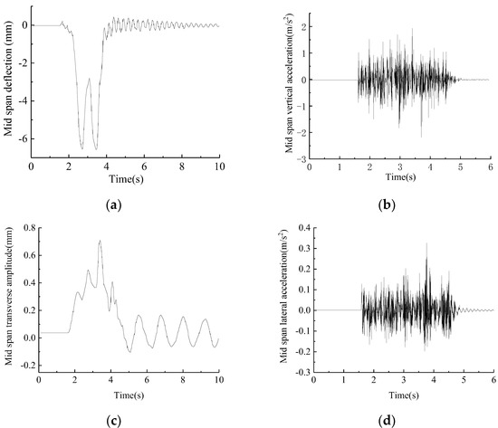 Mid−span vibration response of structure with damping ratio of 0.05: (a) Mid−span deflection (mm). (b) Mid−span vertical acceleration (m/s2). (c) Mid−span transverse amplitude (mm). (d) Mid−span lateral acceleration (m/s2).
