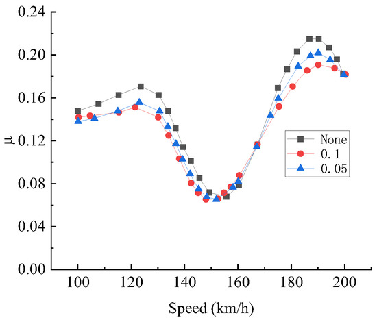 Figure 21 shows the variation in the impact coefficient of the structure with the change in train speed under different damping ratios. The damping effect is not obvious because of the low speed. Speeds from 100 km/h to 200 km/h are selected in this section. Multiple conditions can be found in the figure with the change in the damping ratio. The changing trend does not alter significantly, there are two peaks, and the respective peak times are close while the impact coefficient curve is developing.The first peak appears at 125 km/h and the second peak near 190 km/h. When the damping ratio is small, the curvature at the peak value is large, while the impact coefficient at the neighboring points is relatively small. With the increase in damping ratio, the peak value decreases. Increasing the damping ratio of the beam can reduce the impact coefficient and fulfill a good shock absorption role.