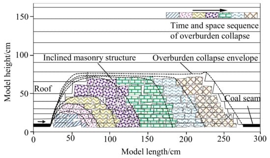 Figure 5. The height and range of overlying strata caving are constantly expanding with periodic weighting, broken rock blocks are transformed into piled rock blocks, and undamaged rock strata form a new envelope of overlying strata caving. With development of the mining face, the range of the overlying strata caving envelope increases. When the working face advances to 51.8 cm, the caving height of overlying strata reaches 10.3 cm; when the working face advances to 73.4 cm, the overlying strata continue to develop upwards and collapse violently, and the development height of fissures reaches 43.8 cm. When the working face is 141.8 cm, the development height of the water-conducting fracture zone reaches the maximum, and does not continue to develop upwards, with a height of 73.4 cm. When full mining is achieved, the height of overburden fracture stability is 73.4 cm, which is similar to the height of abscission layer development shown in