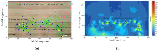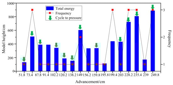 Figure 6a, the dots represent microseismic events, and their colors represent the energy of the microseismic events. Cracks are continuously formed as mining takes place at the working face. In this process, microseismic events are gradually generated and mainly concentrated in the key strata above the mining face (including sub-key strata and main key strata), and a large number of microseismic energy events are mainly concentrated in the range of 50–60 cm above the coal seam, indicating that mining of the working face has a great impact on the disturbance in this area, and most of the microseismic energy are green and blue events. The energy of a single microseismic event is mainly distributed in the range of 0–100 J. There are also a few yellow and red events in the whole mining process, and most of the high-energy microseismic events (red events) are distributed in the later stages of the mining process. Therefore, special attention should be paid to microseismic monitoring in later stages of mining. As shown in