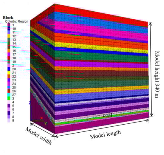 Figure 7. The overall dimensions of the model (length × width × height) were 400 m × 600 m × 340 m. The inclined strata from bottom to top in the model are defined as the 1st to 24th strata in turn, with the 3rd floor being the No. 2 coal seam of 5.6 m. The first and second layers at the bottom of the model are the bottom strata of the coal seam, which are the bottom medium-grained sandstone and mudstone of the coal seam floor, respectively. See