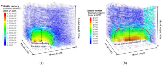 According to Formula (6), the height range of the water-conducting fracture zone is 58–73 m; according to Formula (7), the height of the water-conducting fracture zone is 81 m. The height of the water-conducting fracture zone calculated by empirical formula is relatively low compared with the height studied above, which is due to the complexity of the stratum space, persistence of mining disturbance, influence of non-isotropic body of mine rock mass and its complex structure, differences in physical and mechanical properties, and effects of geological structure. Therefore, the height of the water-conducting fracture zone of overlying rock was different from the actual site.