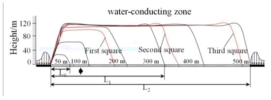 Figure 9 shows the evolution of the water-conducting fracture zones in the 8103 mining face, in which the three red envelope curves are water-conducting fracture zones with the first square, second square, and third square, in turn, and the other black envelope curves are water-conducting fracture zones with the mining times of 50, 100, 200, 300, 400, and 520 m, in turn. Analysis of the development height and range of the water-conducting fracture zone in the process of mining of the 8103 working face revealed that the roof of the