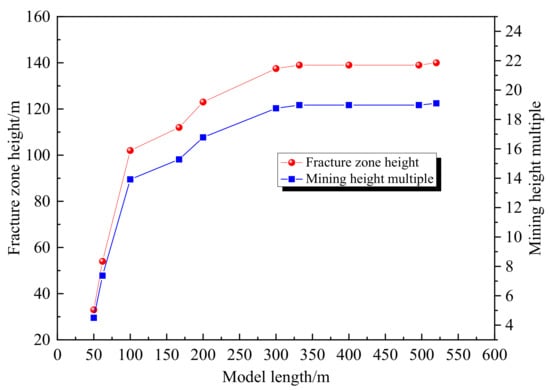 Figure 10. During the mining process of 50–100 m in the first mining face, the fracture expands rapidly, and the maximum development height gradually increases from 28.1 to 89.4 m. In the process of mining between 100–300 m, the upward propagation speed of fractures decreased, and the maximum development height gradually increased from 89.4 to 120.7 m. In the process mining between 300–520 m, the upward propagation speed of fractures was almost zero, and the maximum development height gradually increased from 120.7 to 122.3 m.