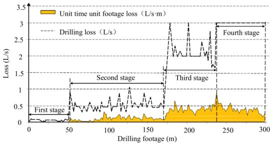 Figure 13. In the first stage, the hole depth was 0–55.6 m, drilling leakage was relatively small, and drilling fluid returned normally. In the second stage, the hole depth was 55.6–170.15 m, drilling leakage suddenly increased, and the return water of drilling fluid visibly decreased. In the third stage, the hole depth was 170.15–238.76 m, and drilling leakage increased by leaps and bounds. The drilling fluid did not return water at 177.02 and 194.06 m, and the leakage and footage per unit time increased four times compared with the second stage. With the continuous increase of drilling footage, the leakage per footage per unit time fluctuated constantly, showing a law of oscillation. In the fourth stage, the hole depth was 238.76–296.75 m, drilling leakage reached a maximum, and the drilling fluid did not return water. According to the drilling leakage and return water of drilling fluid, the height range of the water-conducting fracture zone was within 125.6 m. This is consistent with the results of microseismic monitoring and the numerical simulation.