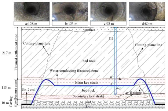 In order to better analyze the height of the water-conducting fracture zone in the Beixinyao Coal Mine and study the development of internal rock fractures, the peephole diagram of the D2 borehole was analyzed. The layout of the D2 borehole is shown in