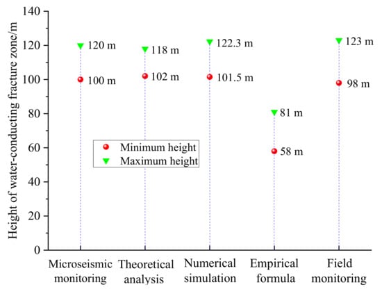 To explore the development of water-conducting fractured zones, different height ranges of water-conducting fractured zones were obtained by comparing different methods, and the height comparison of various water-conducting fractured zones is shown in