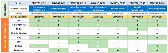 The genomic DNA of the isolated strains was prepared with the Maxwell 16 system (Promega®, Madison, WI, USA), and the 16S rRNA fragments, amplified via polymerase chain reaction (PCR), were analyzed with a DNA sequencer (ABI model 3500 Genetic Analyzer). A SeqMan application (DNASTAR® v.11.2.1, Madison, WI, USA) from Lasergene (Madison, WI, USA) was employed to modify and assemble the obtained nucleotide sequences. The homology comparison (BLAST analysis) was performed, exploiting the National Center for Biotechnology Information server (NCBI, www.ncbi.nlm.nih.gov/blast/Blast.cgi, accessed on 1 August 2022). A collection of seven isolates belonging to the Comamonadaceae, Microbacteriaceae, Bacillaceae and Micrococcaceae families was obtained. These strains were then subjected to a series of in vitro assays to evaluate their plant-growth-promoting (PGP) potential, as reported in [49]. The list of isolates and their PGP properties are shown in Figure 1.