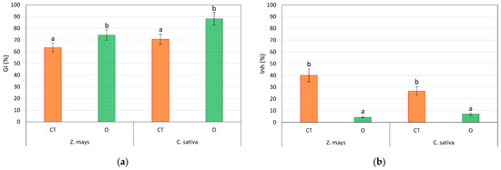 (a) Germination index (GI%) and (b) root elongation inhibition (Inh%) for Z. mays and C. sativa grown on soil control (CT), As-contaminated soil and As-contaminated soil treated with a 0.2 M KHC2O4 + 0.01 M C6H8O6 solution (O). Values are the means of three replicates and the error bars show the standard deviations. Values with different letters are significantly different at the 5% probability level (Tukey’s test).