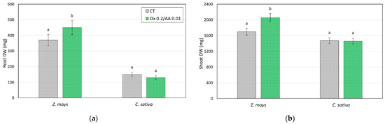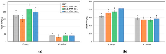 Dry weights (mg pot−1) of (a) roots and (b) shoots of Z. mays and C. sativa grown on soil control (CT) and soils treated with the 0.2 M oxalate and 0.01 M ascorbic acid solution (mesocosm tests). Values are the means of three replicates and the error bars show the standard deviations. Values with different letters are significantly different at the 5% probability level (Tukey’s test).