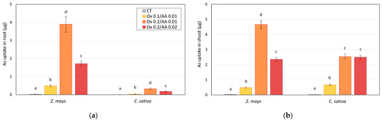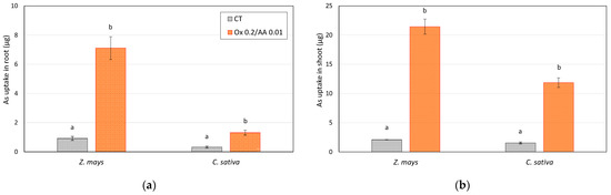 Arsenic uptake by (a) roots and (b) shoots of Z. mays and C. sativa grown on soil controls (CT) and soils treated with the 0.2 M oxalate and 0.01 M ascorbic acid solution (mesocosm tests). The values are the means of three replicates and the error bars show the standard deviations. Values with different letters are significantly different at the 5% probability level (Tukey’s test).