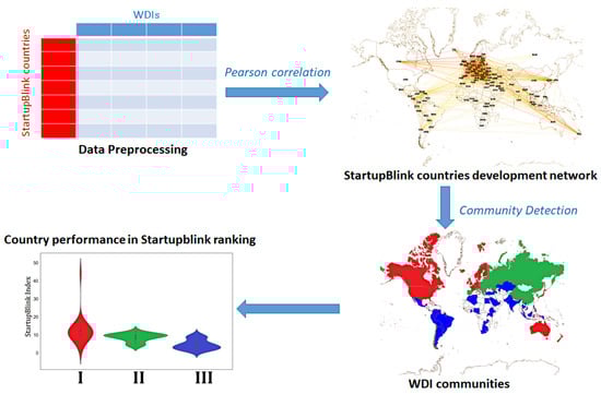 In this section, we first present the indicators that determine the StartupBlink ranking and describe the World Bank database employed to set up the complex network. Then, we focus on network construction: StartupBlink-ranked countries, representing nodes, are mutually connected by links whose strength increases with similarity, measured by Pearson correlation coefficient among the corresponding WDI sets. We also discuss the steps of community detection, which provides a partition of the considered countries that will be used to interpret the StartupBlink ranking. Moreover, we present the outcomes of alternative paths to partition the country set based on clustering algorithms. A concise representation of the workflow followed in our research is reported in Figure 1.