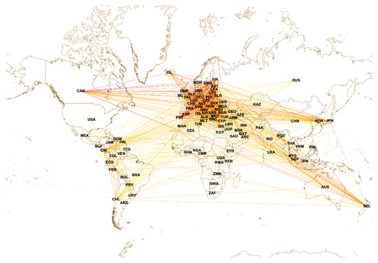 The 426 selected WDIs were employed to evaluate the pairwise Pearson correlations between countries. Then, we constructed a complex network constituted by 100 nodes, each representing a StartupBlink country. Pairs of nodes were connected by weighted edges, whose weight was determined by the pairwise Pearson correlation between the sets of WDIs associated to the corresponding countries. In particular, we retained those links whose Pearson correlation was statistically significant (at the significance level). We thus obtained a connected network of 100 nodes with 4782 weighted links. A geographical distributed version of the network is depicted in Figure 2.