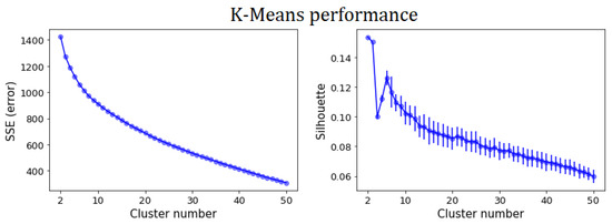 where is the average distance between and all other points in the same cluster (cluster cohesion), while is the average distance between and all points in the nearest cluster (cluster separation). The optimal number of clusters should coincide with the elbow point of the SSE vs k curve [60] and, at the same time, with the maximum of the mean Silhouette score. If these two conditions are not satisfied together, one can conclude that K-means is not well suited for clustering the considered data.