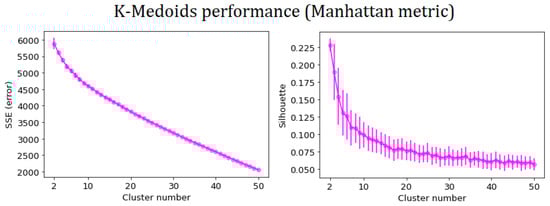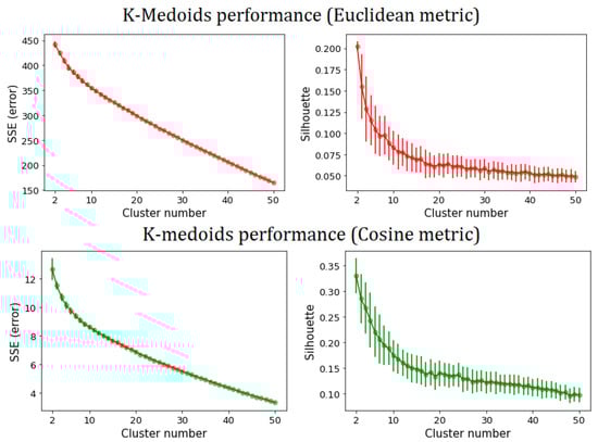 The same reasoning on the clustering quality applies to K-medoids, an algorithm similar to K-means, in which actual data points, instead of centroids, are chosen as cluster centers. K-medoids can be used with arbitrary distances [61]; hence, we considered three common metrics to calculate SSE and mean Silhouette score: Euclidean, Cosine and Manhattan.
