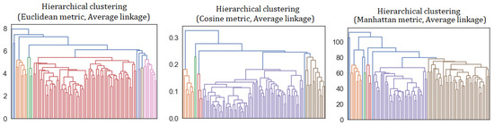 Hierarchical clustering algorithms take an alternative approach to group similar items [62], which entails the advantage of not needing to fix the number of clusters. In this work, we implemented an algorithm that starts with each data point considered as an individual cluster and iteratively merges the closest pairs of clusters until it ends up with a single cluster encompassing all data points. In order to avoid the effect of outliers and putting all points in clusters on a same ground, average linkage was applied: namely, cluster pairs were merged based on the minimum average distances between all group members in the two clusters. Additionally, in this case, we considered three metrics to calculate distances among clusters: Euclidean, Cosine and Manhattan. The described algorithm is deterministic and allows us to obtain dendrograms, which can help with the interpretation of the results. We remark that, since hierarchical clustering algorithms are not optimization problems, SSE and Silhouette are not reliable measures of the partition quality. Accordingly, we choose the IPR values at various levels of the dendrogram as a metric factor for each of the considered metrics.