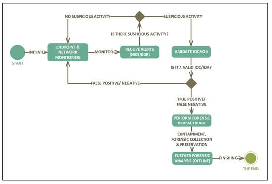 The proactive digital forensics investigation begins with network and endpoint monitoring, where a monitoring server assisted by an agent (in the case of an EDR) or a network tap (in the case of NIDS) constantly communicates with the network and host devices over a network in the search for suspicious behaviour. The status corresponds to an alert or notification received, and the forensic investigator verifies whether it is a positive, false positive, negative, or false negative. The investigator checks whether an Indication of Compromise (IOC) or an Indication of Attack (IOA) exists or not. Given that it exists, an investigation is initiated either on the network or the endpoint. The identification of artefacts is automatic in known attacks, which makes it easier for the forensic investigator to extract and preserve the evidence. The investigation is performed on top of security monitoring, where there is increased visibility on both the network and endpoint devices. The security events received are based on the NIDS detection capabilities either using signature-based identification or behavioural analysis. Based on the events on the NIDS, the analyst then performs a digital triage on the endpoint to obtain further details.