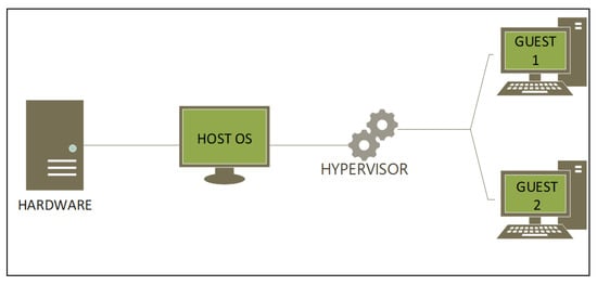 A type 2 hypervisor was utilised to set up a basic infrastructural design that simulates info-communication infrastructure, as shown in Figure 2 below. It illustrates how computer hardware with an installed operating system can host several guest computers leveraging a hypervisor. The goal of the hypervisor is to create a link between the operating systems hosted on the virtual machines and the host operating system within the dynamic broadcasting mode [25]. Hence, virtual machines were installed, which are capable of working independently, communicating over a network, and accessing resources offered by the host machine.