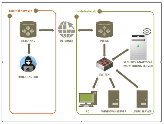 Figure 3 illustrates the virtualised components interaction model. It consists of three parts: the attacker (the threat actor connecting with the external router), the internet, and the internal network (connecting through the inside network). The researchers made use of the Kali Linux virtual machine as a penetration testing tool [26]. On the edges of the attack region (External) and the internal network (Inside) are two routers. Vyos [27,28] virtualised routers are used to create a WAN network. In the internal network, there is one switch that connects the Linux web server, the Windows server, and the Analyst workstation.