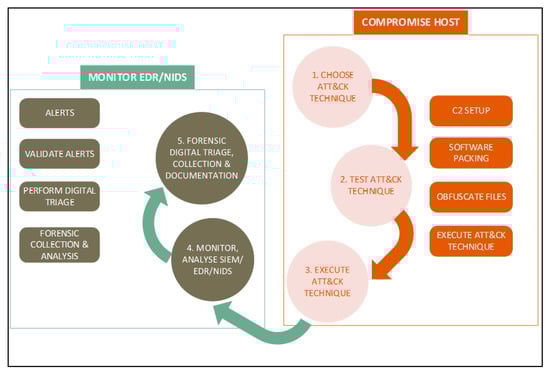 To perform digital forensics, the researchers implemented the Integrated Digital Forensic Process model (IDPFM) [29]. The process model has five stages, which are: preparation, incident, incident response, digital forensic investigation, documentation and presentation. To simulate real-world attacks, the researchers adapted the Mitre ATT&CK atomic cycle to invoke or trigger incident detection capabilities. The researchers chose an ATT&CK technique [30], selected a test area, and executed the test to invoke systems security information in the form of events and alerts. In response to the simulated attacks, the researchers closely monitored the EDR and/or NIDS alerts for indications of compromise/attack. The researchers performed forensic investigations on the endpoint and the network, tracing the attack assuming the role of an investigator who does not know how the attack transpired. Figure 4 illustrates the testing technique employed by the researchers.