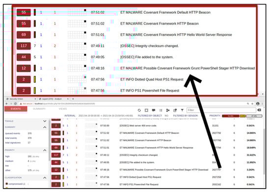 The alerts shown in Figure 7 indicate a compromised system (hence the insignia colour), and from it, the analyst observed that there was a PowerShell file request made over an HTTP connection which was associated with a Covenant C2 framework attack. However, in real life, these connections may be encrypted with a secure transport (TLS), making the connections difficult to detect. The analyst further examined the alerts to pull a CapME transcript to obtain details of the network traffic flow (Figure 8) and observed a PowerShell script block. The transcript is a textual format of a full packet capture and can also be downloaded as a full network packet capture specifically for that event.