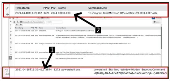 In Figure 9, label 1, the analyst observed evidence of a PowerShell process creation with an encoded command consisting of -nop (no profile) and –Window Hidden (window hidden) attributes. It is evident that the excel.exe process with PID (process identification number) 2844 initiated the powershell.exe process with PID 3272, whilst the powershell.exe invoked the conhost.exe with PID 2880, which is used to assist third-party software in initiating and managing the command line. It is not normal for software like Microsoft Excel to launch system programs such as PowerShell, and this is suspicious behaviour.