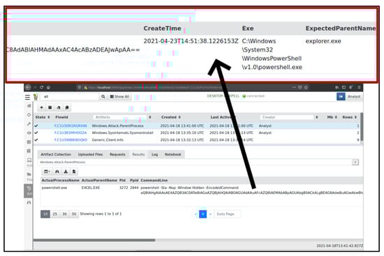 The analyst queried for a parent-child process attack using the artefact Windows.Attack.ParentProcess. The Velociraptor artefact validates whether an adversary or malware is maliciously executing a legitimate process or not. The results showed that powershell.exe was the actual process name, and the actual parent’s name was excel.exe. However, since the program is invoking the command line through conhost.exe, the expected parent name is explorer.exe, thus confirming the presence of malicious code executing through a legitimate process, as shown in Figure 10.