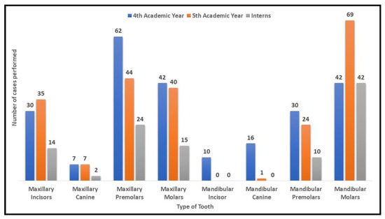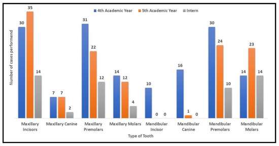 Number of endodontic treatments performed (tooth type-wise) by students of different academic levels.