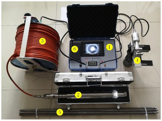 Digital panoramic borehole camera system (1—Control box; 2—Optical probe; 3—Flexible cable; 4—Depth encoder; 5—Rigid push rod; 6—Power supply).