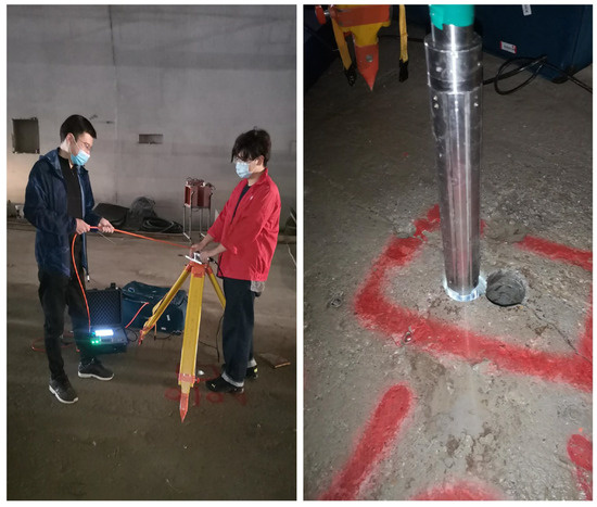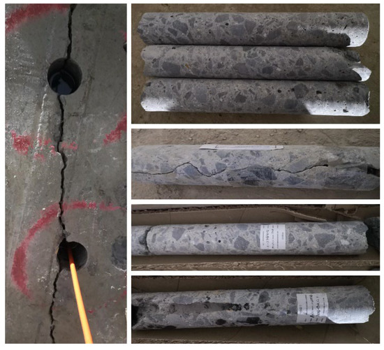 The measurement project is a highway tunnel with open excavation and concealed burial construction. After backfilling with soil and stone, a long and deep crack appeared on the bottom plate along the axis of the tunnel, as shown in Figure 4. In order to quantitatively evaluate the cracks, several drilling and coring operations were carried out at the crack location. However, the drilled concrete core cannot accurately describe the characteristics of cracks. Because some concrete cores are broken and damaged, it is impossible to determine whether the damage is caused by drilling factors or crack expansion. More importantly, it is difficult to determine the width of cracks and the extension direction inside the concrete, and it is impossible to evaluate the development of cracks with time through the concrete core.