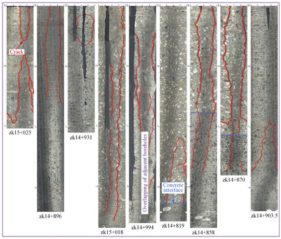 After measurement, high-resolution borehole wall images of nine measurement holes were obtained, as shown in Figure 6. In the borehole wall image, structural information, such as aggregate, damage, and cracks, can be clearly observed. For the convenience of viewing, the shape of the crack is depicted with red lines in Figure 6. It should be reminded that the wide black vertical defects in the figure are not cracks, but borehole wall defects caused by the overlapping of adjacent boreholes. There are two types of cracks in the nine boreholes, the cracks that expand from the orifice (zk15 + 025, zk14 + 896, zk15 + 018, zk14 + 994, zk14 + 858, and zk14 + 870) and the cracks inside the concrete (not extending to the orifice; zk15 + 025, zk14 + 931, zk14 + 819, and zk14 + 903.5).