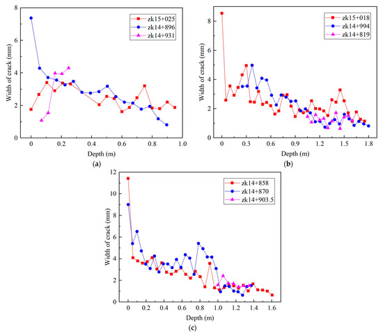 Statistical analysis of crack depth and width. (a) Boreholes zk15 + 025, zk14 + 896, and zk14 + 931. (b) Boreholes zk15 + 018, zk14 + 994, and zk14 + 819. (c) Boreholes zk14 + 858, zk14 + 870, and zk14 + 903.5.