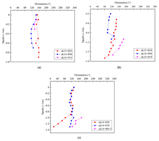 In this paper, the crack orientation at different depths in nine boreholes was calculated, and the statistical results are shown in Figure 9. It should be pointed out that the orientation can be calculated only when two cracks appear in the borehole wall image. (1) In borehole zk15 + 025, although the upper and lower cracks were not continuous, the orientation of the two cracks was very close, both distributed in the range of [142°,158°], and the crack orientation at the orifice was 151°. (2) In borehole zk14 + 896, the change in crack orientation was relatively gentle, distributed in the range of [114°,143°], and the fracture trend at the orifice was 143°. (3) In borehole zk14 + 931, the crack orientation was distributed in the range of [133°,144°]. (4) In borehole zk15 + 018, affected by the intersection of adjacent boreholes, only one crack appeared in the borehole wall image of the first 0.5 m, so the orientation of the crack cannot be calculated before 0.5 m. After 0.5 m, the crack orientation continued to change, gradually deflecting from the initial position of 145° to the due east direction until 80°. (5) In borehole zk14 + 994, there was only one crack in the borehole wall image of 0.5–0.8 m due to the intersection of adjacent boreholes, so the crack orientation could not be calculated in this section. The crack orientation of this borehole was distributed in the range of [94°,129°], and the crack orientation at the initial position was 112°. Before 0.9 m, the change in crack orientation was very small, and the crack orientation suddenly changed significantly within the range of 0.9–1 m, increasing from 94° to 129°. (6) In borehole zk14 + 819, the crack orientation continued to decrease from the initial position of 184° to 125°. (7) In borehole zk14 + 858, the orientation of the crack changed little before 0.9 m, and the orientation of the crack at the orifice was 132°. After passing through the concrete interface, the crack orientation changed significantly, continuously decreasing from 114° to 19°. (8) In borehole zk14 + 870, the crack orientation changed little, distributed in the range of [103°,132°], and the crack orientation at the orifice was 132°. (9) In borehole zk14 + 903.5, the crack orientation was distributed within the range of [122°,165°], and the crack orientation at the initial position was 165°.