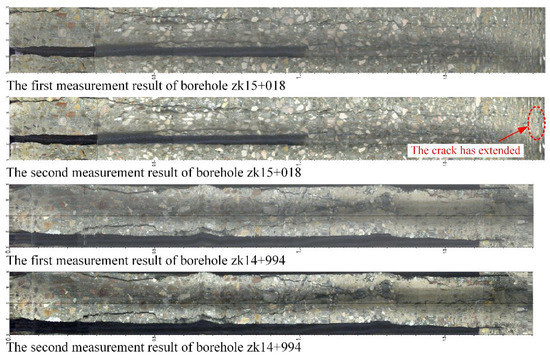 The development of a crack is a dynamic process, and the change in its morphological characteristics with time is an important factor to be considered. The stable or slow development of crack morphology is the desired result of engineers. If the cracks continue to extend and widen over time, this will bring great difficulties to the evaluation and repair of concrete structures. Therefore, it is necessary to regularly observe the crack morphology. Due to the construction requirements, most of the boreholes were quickly blocked after the first measurement. Only boreholes zk15 + 018 and zk14 + 994 were allowed to remain as observation boreholes. Fifteen days after the first measurement, boreholes zk15 + 018 and zk14 + 994 were measured again with the same borehole camera equipment. Figure 11 shows the comparison of borehole wall images obtained from the two measurements. There was only a slight difference between the two measurement results. In borehole zk15 + 018, the second measurement found that the crack continued to extend 6 mm downward, while in borehole zk14 + 994, no significant crack extension was found. The crack width of the two boreholes at the orifice basically increased by 2 mm. This may be due to the vibration caused by vehicles and pedestrians on the tunnel surface, resulting in the falling off of mortar and aggregate. However, below the orifice, the crack width had no obvious expansion trend.