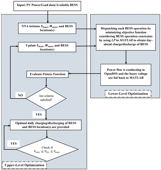 - The NNA produces the initial population for the optimization problem. The explanation of NNA is presented in Section 3. NNA pattern solution populations are represented as a vector containing battery sizes in and and location of each BESS, which are the variables to be optimized in the upper-level optimization problem. In other words, the vectors’ dimension is three times the number of BESS that are deployed in the network and are real variables, while the location () is an integer variable as it represents the house number. If we have, for instance, three available batteries to be installed in the network, nine decision variables are optimized by NNA.where , , and are BESS capacity in , BESS capacity in and the location of the first BESS, respectively. The size of vector increases as the available batteries increase.