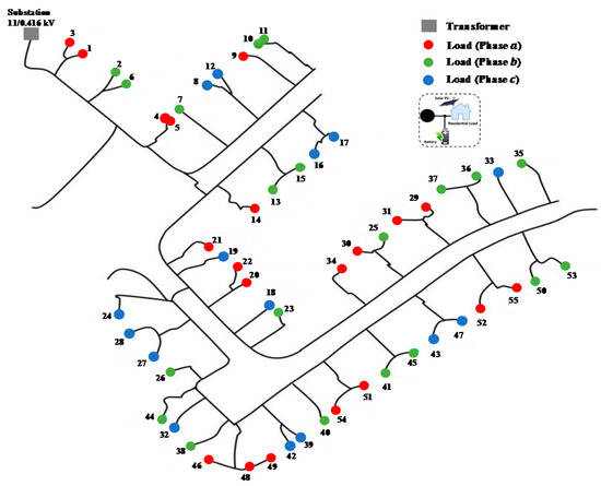 The proposed methodology has been applied to the IEEE low voltage test feeder shown in Figure 3. The feeder is a radial distribution feeder, and the substation transformer steps down the voltage from 11 kV to 416 V. The transformer at the substation of this test feeder has a rated kVA of 800, and the tap setting of the secondary part of the transformer is set to 1.02 p.u. to make the overvoltage and undervoltage problem more vivid. It is assumed in this study that each bus in the distribution network is a load bus and is equipped with a rooftop solar PV with a rate of 10 kWp. The power flow simulations are conducted utilizing OpenDSS, while the numerical calculations and the daily BESS dispatch are obtained by LP using MATLAB.