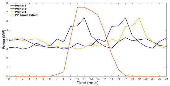 The load profile is based on real data obtained from a home located in Riyadh, Saudi Arabia, and was recorded by the Saudi Electricity Company. In this study, three load profiles were considered to make the overvoltage and undervoltage phenomena in the LV distribution system more pronounced and account for load profile diversity. Therefore, load profile 1, shown in Figure 4, is time-shifted back by seven hours to form load profile 2 and two hours later to form load profile 3. These load profiles are then randomly distributed to represent the load at each bus. The PV output power is scaled down from real-time data collected from the 120 kWp PV system placed on a rooftop of a mosque in Riyadh city. This location is operated by both King Abdelaziz City for Science and Technology and the Saudi Electricity Company. The PV output data gathered from the unit are in 1-h intervals for the period between 3 June 2017–31 August 2018. The time resolution of the load and the PV power is 1 h, and their profiles on 31 January 2018 are shown in Figure 4. The PV inverters are assumed to operate at a unity power factor. This study assumes that the utility has ownership of the PV systems and BESS. Therefore, these devices are fully controlled by the utility to prevent the voltage in the distribution systems.