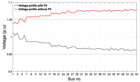 Network daily voltage profile with and without PV system at different load buses.