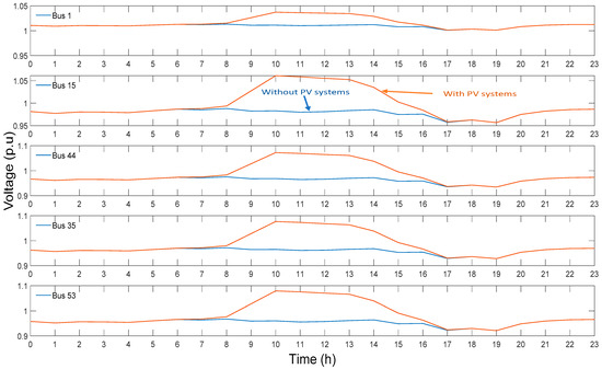 The voltage profiles with and without the PV systems at buses 1, 15, 44, 35, and 53 are shown in Figure 6. In the case without PV systems, Figure 6 exhibits that the voltage levels at each load bus are within the voltage operation thresholds during daytime hours. However, the lower threshold is violated during the peak load time. Between 17 p.m. and 20 p.m., the voltage starts dropping as we go further away from the main transformer due to the heavy load. This situation is expected in conventional distribution systems where the demand levels are the utilities’ primary concerns. However, with the PV systems operation, the voltage rise is observed at midday due to the excess power from the PV systems. When the rooftop PV units placed at each home generate more power than the home electricity demand, it sends this excess power back to the main grid. The voltage from the solar inverter must create a voltage that is a few volts higher than the grid voltage for electricity to flow from the home to the grid. The voltage levels become higher at the homes located away from the main feeder to enable the power to flow back to the grid. At the same time, the undervoltage problem occuring at night coincided with the peak load and low renewable energy from the PV systems. Figure 6 indicates that the buses at the end of the feeder encounter the worst voltage rise.