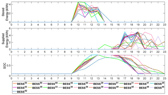 The optimal battery charging and discharging of each battery storage is exhibited in Figure 7. At the peak PV incidents, the batteries start charging the excess power from PV systems (from 10 a.m. to 14 p.m.) instead of being injected into the grid and causing reverse power and overvoltage. At peak demand (from 17 p.m. to 21 p.m.), the batteries supply stored energy back to the local load to increase the system voltage. The charging and discharging rates of batteries located at the end of the feeder happen frequently at the peak PV and peak load periods. The main reason is that these buses have the worst voltage profile and contribute greatly to minimizing the over- and undervoltage in the network. Considering five BESS cases, for instance, the capacity of each of them is 13.5 kWh at a rated power of 5 kW. Their charging and discharging rates are higher at the hours when the voltage is deviated (rise/drop). After that, the charging and discharging rates differ among the remaining batteries. This is because the overvoltage is reduced locally at different hours, and there is no need to charge the batteries at the peak PV moments. Additionally, it can be seen from Figure 7 that the energy of the batteries at the beginning of the day is the same as their energy at the end of the day, adhering to the batteries’ operational constraints.