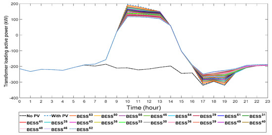 Figure 8 shows the net transformer loading with the optimal addition of the BESS in the network. The curve with reflects the level of reduction in the transformer loading active power when four batteries are placed optimally in the network at four different homes, namely the homes at bus 53 ( bus 50 (), bus 55 (), and bus 45 (). A similar analogy is reflected in the remaining curves. Therefore, the curve with displayed in Figure 8 depicts the transformer loading active power when 21 BESS are installed optimally in the network. From this figure, both export and import peak power are minimized considerably by increasing the number of batteries installed in the network. With the optimal planning of 21 BESS, export and import peaks are reduced by 40.14% (from 195.211 kW to 116.845 kW) and 29.76% (from 320.088 kW to 224.838 kW), respectively.