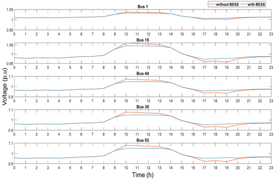 Network daily voltage profile with and without BESS at different load buses.