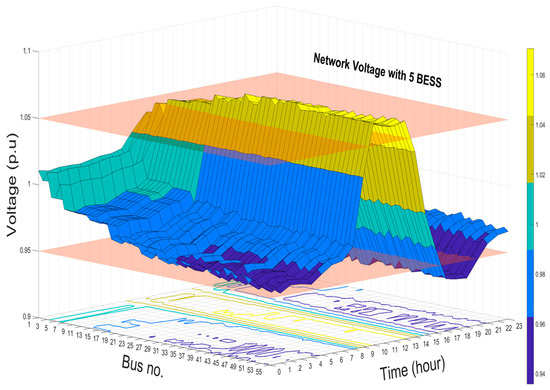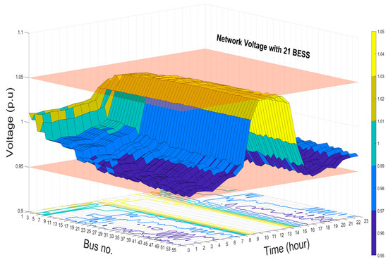Results of the voltage profiles with and without BESS at buses 1, 15, 44, 35, and 53 are shown in Figure 10. The voltage profile accepts the upper and lower network voltage when the BESS are optimally installed and operated in the network. In addition, the levels of improvements in the network voltage when 5, 17, and 21 BESS installed are shown in Figure 11, Figure 12 and Figure 13, respectively. These 3D figures depict the improvement in the voltage at all the system buses. Finally, the optimal management of the capacity and allocation of BESS in the distribution system results in the enhancement of the overall grid voltage, reduction in system losses, and peak shaving.