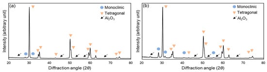 Phase identification of the Y-TZP specimens was performed using X-ray diffractometry (XRD, PW3040/60 X’Pert Pro, PANalytical, EA Almelo, Netherlands) equipped with Cu Kα radiation (λ = 0.1541 nm) under operating conditions of a voltage of 40 kV and a beam current of 30 mA. The scan range was 20° < 2θ < 80° with a step size of 0.02°, and a counting time of 0.6 s per step was used.
