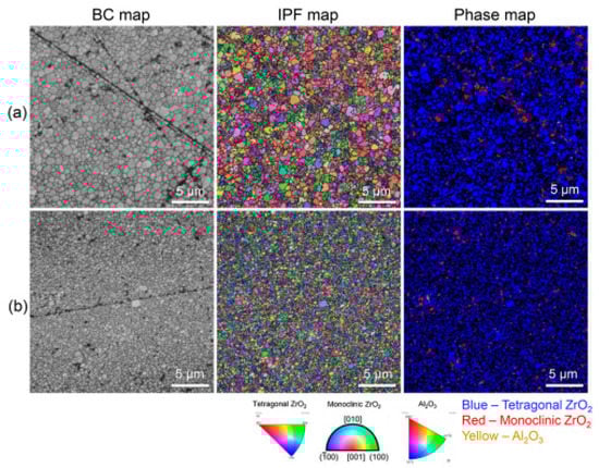 Electron backscattered diffraction (EBSD) scans were carried out using the SEM equipped with an EBSD detector (Nordlys Nano, Oxford Instruments) to ascertain the crystallographic orientation of the Y-TZP ceramics. Scanning was carried out with a scanning step of 0.5 μm, a voltage of 20 kV, and a beam current less than 20 nA. AZtec and Channel 5 software (Oxford Instruments) was used to analyze the data. Using this analysis, the band contrast (BC), inverse pole figure (IPF), and phase maps of the ceramics were acquired. In addition, the grain sizes of both Y-TZP ceramics were determined by EBSD analysis.