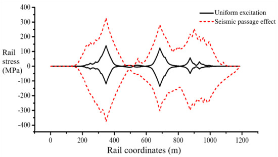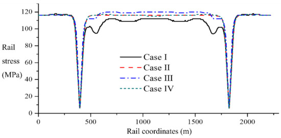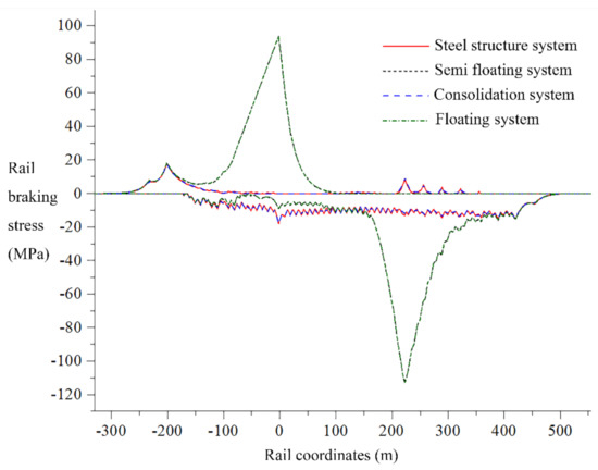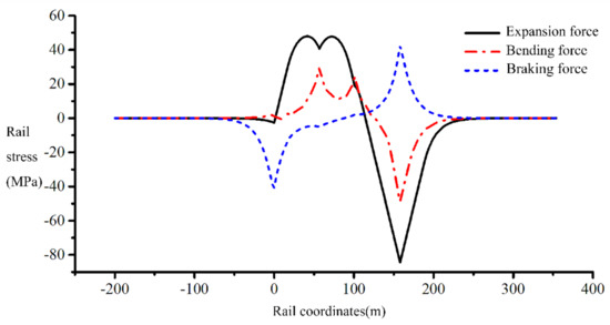 When the longitudinal force of CWR on the bridge is analyzed, the multi-span simply supported beam on both sides can be simplified as six spans under the condition that the difference of the longitudinal stiffness of the substructure is small. When calculating the rail expansion force, the overall temperature rise of the steel truss beam is 25 °C, and that of the concrete beam is 15 °C [33]. When calculating the bending force, the bridge design standard live load adopts the medium live load, and the two sections under the extension vehicle and the vehicle are equally loaded on the beam element. When calculating the braking force, the wheel rail adhesion coefficient is taken as 0.164, and the results are shown in Figure 2 [34].