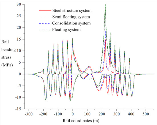 In different structural systems, the diagram of rail braking force and bending force when the train passes through the whole bridge is as shown in Figure 5 and Figure 6 [39]. The distribution law of the additional longitudinal force of the seamless track on the cable-stayed bridge is the same as that on the ordinary bridge. The change of the cable stiffness has little effect on the longitudinal interaction of the seamless track on the bridge. The influence is smaller. When designing the seamless track on the bridge, it is recommended that the influence of the rigidity changes of the stay cables and the main tower should not be considered [40,41].