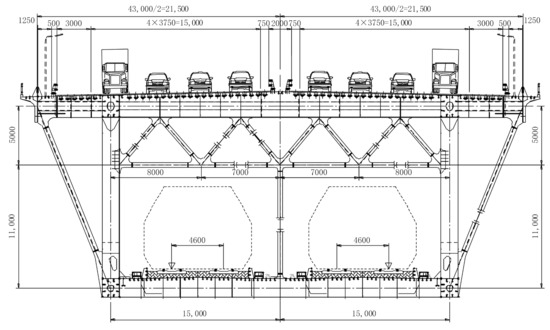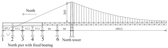 The span of the ground-anchored suspension bridge with a double-tower continuous steel truss girder for highway and railway is (84 + 84 + 1092 + 84 + 84) m. The upper layer is equipped with an eight-lane expressway, and the lower layer is equipped with a double-line passenger-dedicated line and a double-line intercity railway, with the line spacing of 4.6 m. The width of the upper deck is 43 m, the width of the lower deck is 30 m, and the beam height is 16 m. The mid-span section of the bridge is shown in Figure 12. The north tower is 203 m high, and the south tower is 191 m high. Both towers have box sections. The side span of the main girder is 350 m (refer to Figure 13). Considering the main cable, suspender, steel truss, orthotropic plate, and the adjacent bridge structure, the model of the interaction between suspension bridge and four tracks is established. Only considering vertical and transverse constraints at the joint of the main truss and the crossbeam of tower, no constraint in the direction of the bridge is considered. The vertical and transverse displacements are constrained at moveable bearings. Six equally stiff springs are used to simulate the pier group foundation at the bottom of the tower. The adjacent bridges will adopt the option of a continuous bridge. The fixed bearing is set at the central pier, and moveable bearings at the other piers. Nonlinear bar elements are used to simulate the ballast track without considering the influences of the track–bridge transverse displacement on the track–bridge longitudinal interaction. By using the linear spring to simulate the vertical stiffness of the fastener, the model of longitudinal force on CWR on a suspension bridge is partly shown in Figure 14.