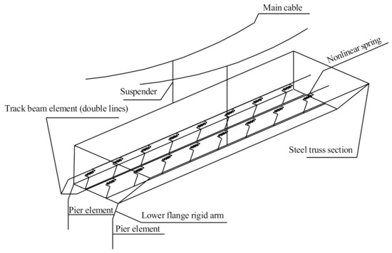 In 2001, Yang used the nonlinear beam element to simulate track–bridge contact and the rigid arm to simulate the beam span height. Based on algor nonlinear structural finite element analysis software, the mechanical model of the interaction between the plane bar track structure and the bridge was established. The calculation results of the model were similar to the measured results [17].